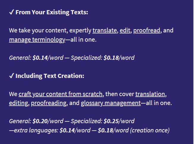 We deliver fast, affordable multilingual solutions tailored to your business. Pricing starts low for general content, rises for specialized sectors—extra languages at $0.14–$0.18/word.Marketing & Advertising: Ads, posts, and campaigns that sell in any language.